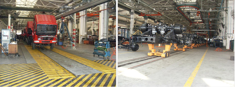 一線副線垂直地拖鏈采用標(biāo)準(zhǔn)板式牽引鏈帶臺(tái)板的結(jié)構(gòu)方式,主要由驅(qū)動(dòng)裝置、傳動(dòng)軸總成、拉緊軸總成、中間支架、車架支撐小車、頭架總成、尾架總成等,相對(duì)于一線主線的控制部分獨(dú)立分開(kāi),不設(shè)聯(lián)鎖功能。該生產(chǎn)線共有14個(gè)工位,每個(gè)工位設(shè)工位三色顯示燈,左右兩側(cè)各設(shè)按鈕和一個(gè),有急停、求援和缺件三個(gè)按鈕,按鈕盒沿線布置。系統(tǒng)設(shè)大屏幕顯示屏,用于車間內(nèi)現(xiàn)場(chǎng)輸數(shù)據(jù)的實(shí)時(shí)同步顯示,顯示內(nèi)容為“年計(jì)劃、月計(jì)劃、目前已生產(chǎn)累計(jì)產(chǎn)量等”顯示內(nèi)容可存儲(chǔ),產(chǎn)量自動(dòng)累加,支持電腦后臺(tái)管理。一線副線的支撐臺(tái)車與先前的生產(chǎn)線互相通用,并逐一編號(hào)形成標(biāo)記。